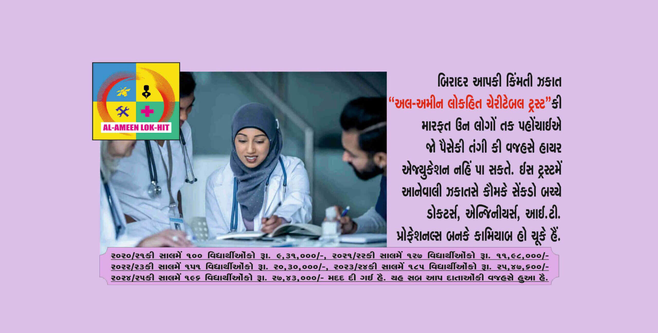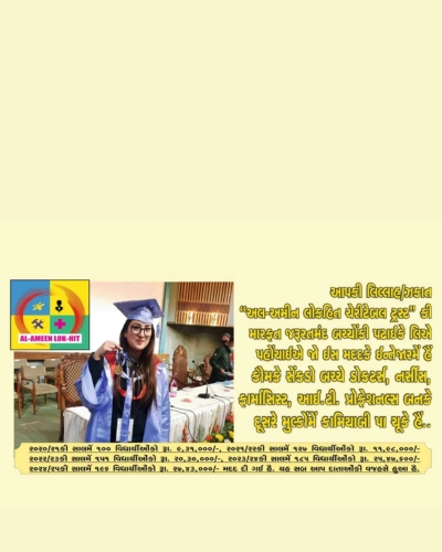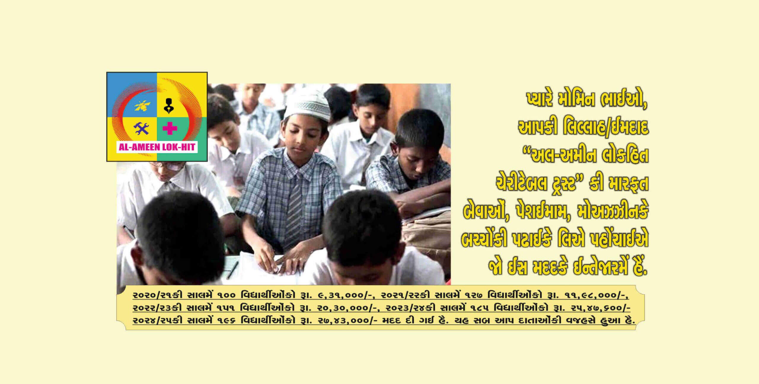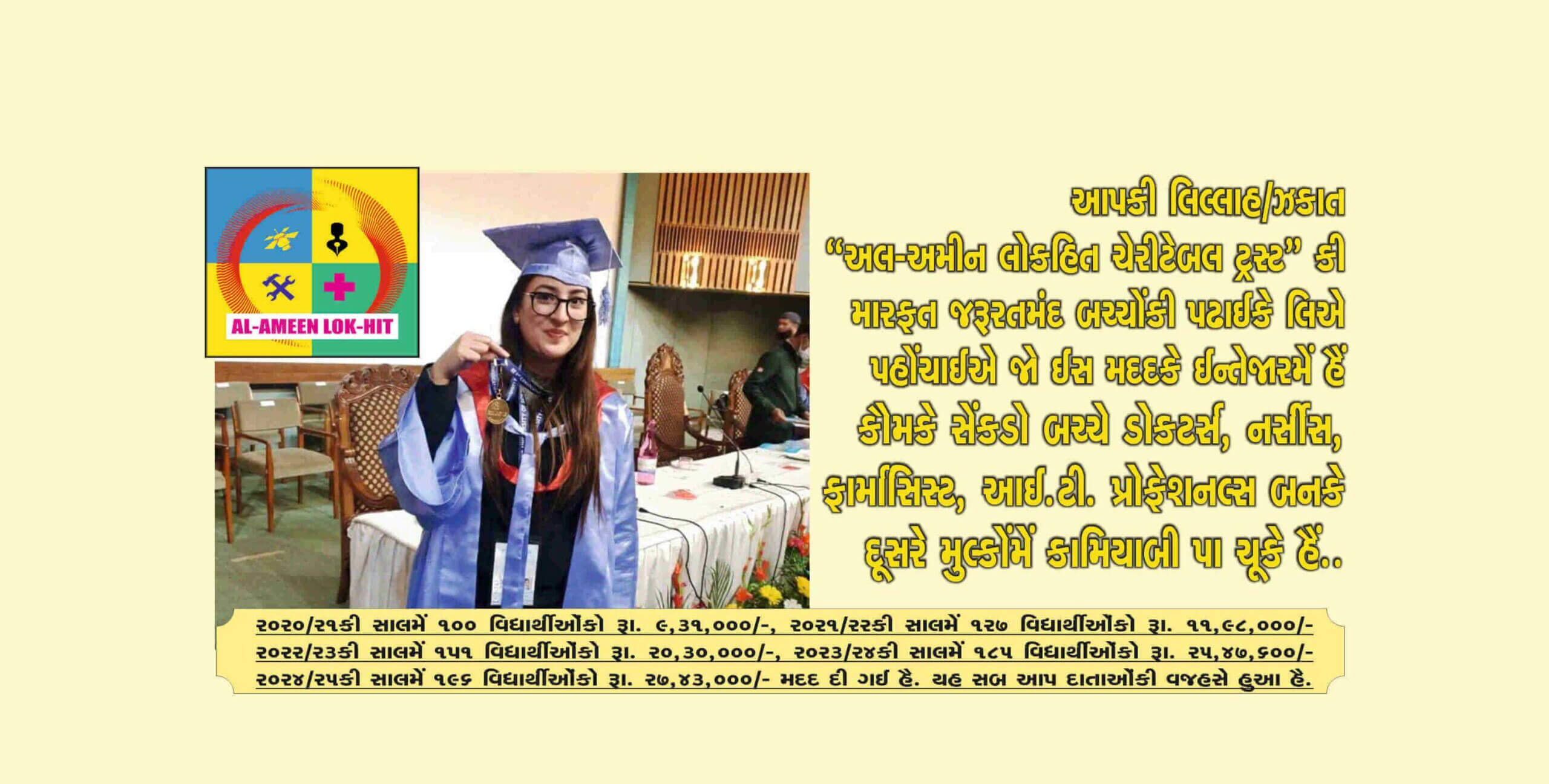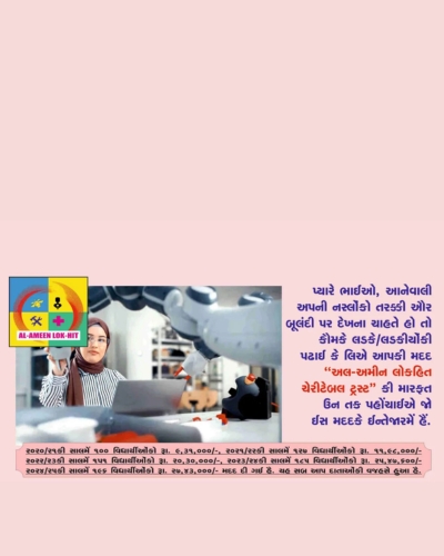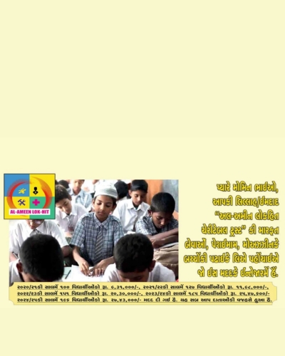 “In 1994 Late S.B.Tirmizi and his team established “Alameen Lokhit Charitable Trust” to help needy parents whose children are facing financial hardships to meet their educational expenses. The trust is doing the noble work since 1994 by collecting donation/Zakat money and helped thousands who were benefitted and built their carriers. The financial assistance given by the trust is very near to Rs. 4.67 crores and 7669 students assisted bytrust are earning well, setteled in abroad and enjoying good status inthe society. corona pandemic and Ukrain war have badly affectedearning of people and still effects continued. Price rise of all commodities has forced parents to search NGOs, institutions who helpthe students for their study. ‘Al-Ameen Lok-hit Charitable Trust’ is one of the them, approched by muslims for help. You can see the number of students and amount of assistance of the Years 2021, 2022, 2023 & 2024. In the year 2020-21 100 students were assisted for Rs. 9,31,000/- Lacs, 2021-22 127 students with Rs. 11,98,000/- Lacs, 2022- 23 151 students with Rs. 20,30,000/- Lacs, 2023-24 185 students has assisted by Rs. 25,47,600/- Lacs and in current year up to Feb. 2025 196 students has assisted by Rs. 27,43,000/- Lacs.