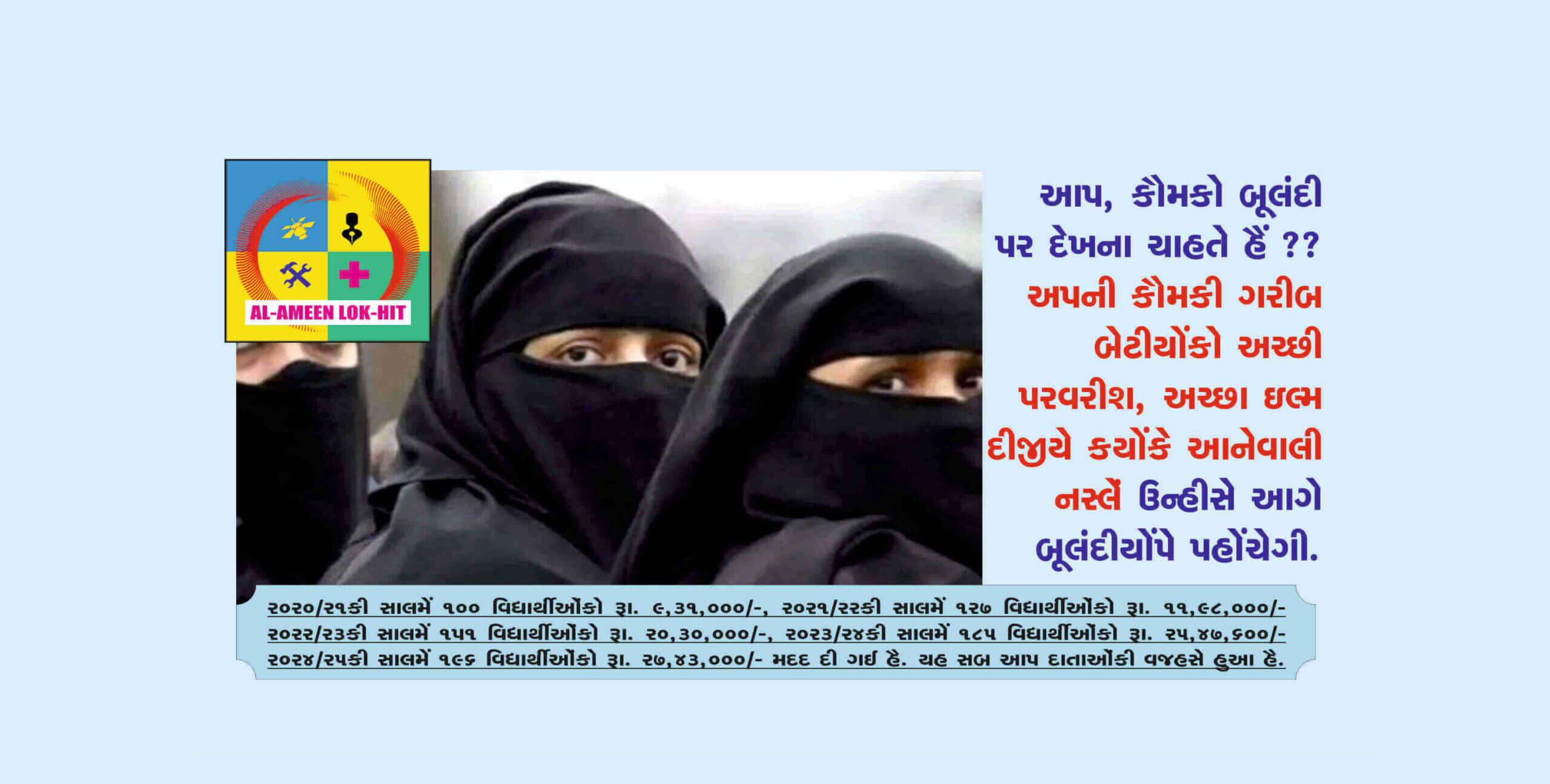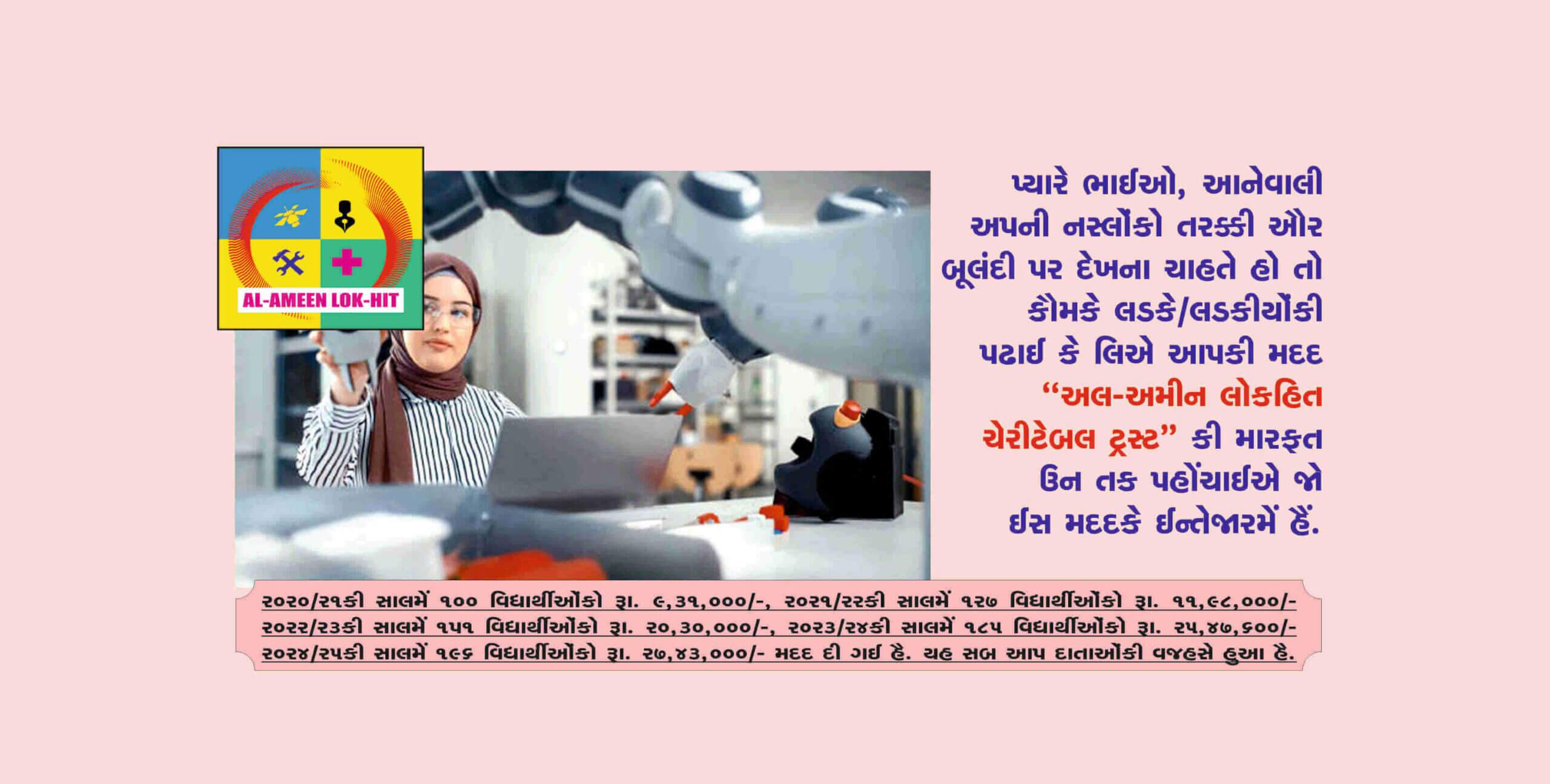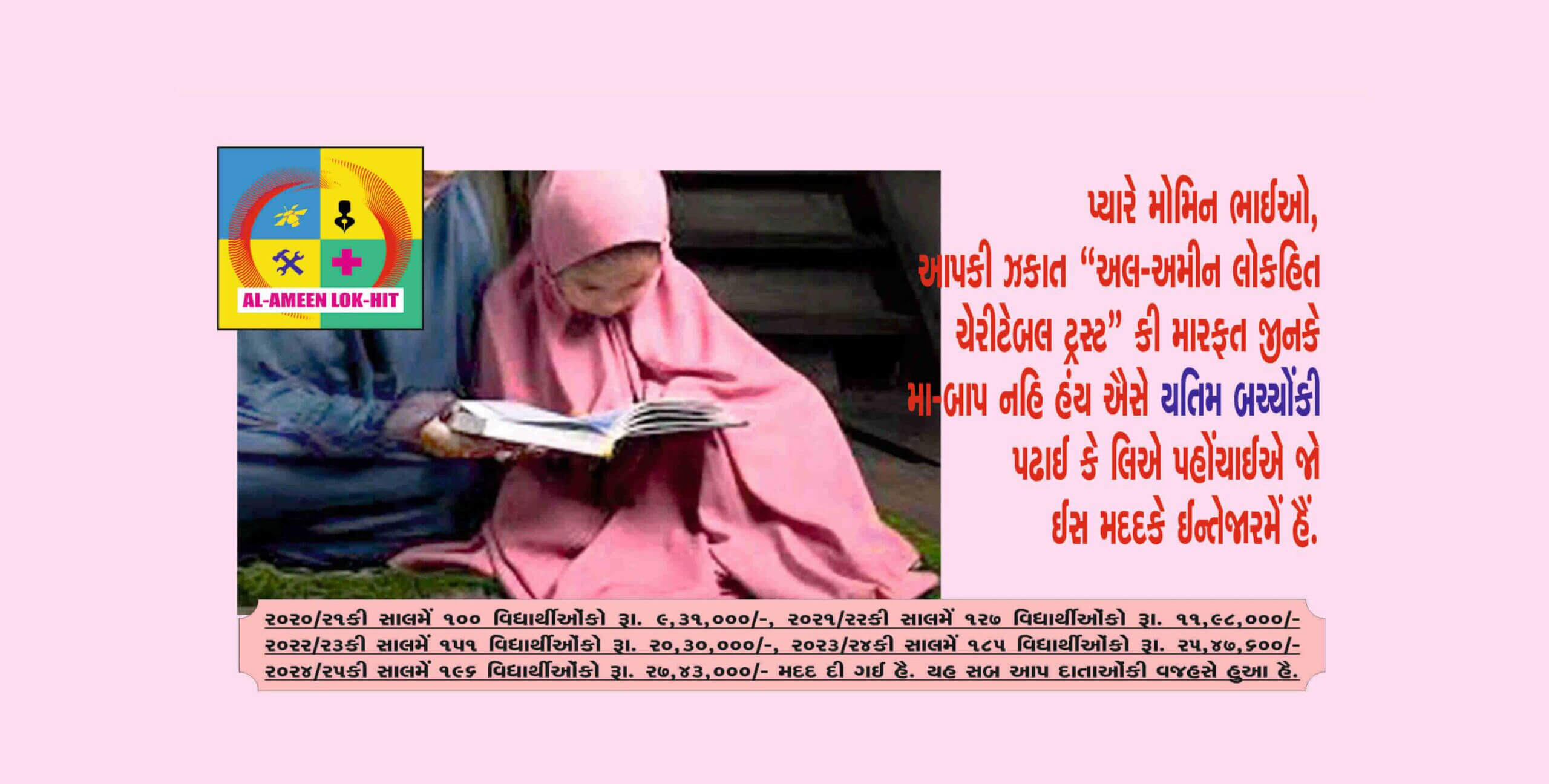 “In 1994 Late S.B.Tirmizi and his team established “Alameen Lokhit Charitable Trust” to help needy parents whose children are facing financial hardships to meet their educational expenses. The trust is doing the noble work since 1994 by collecting donation/Zakat money and helped thousands who were benefitted and built their carriers. The financial assistance given by the trust is very near to Rs. 4.67 crores and 7669 students assisted bytrust are earning well, setteled in abroad and enjoying good status inthe society. corona pandemic and Ukrain war have badly affectedearning of people and still effects continued. Price rise of all commodities has forced parents to search NGOs, institutions who helpthe students for their study. ‘Al-Ameen Lok-hit Charitable Trust’ is one of the them, approched by muslims for help. You can see the number of students and amount of assistance of the Years 2021, 2022, 2023 & 2024. In the year 2020-21 100 students were assisted for Rs. 9,31,000/- Lacs, 2021-22 127 students with Rs. 11,98,000/- Lacs, 2022- 23 151 students with Rs. 20,30,000/- Lacs, 2023-24 185 students has assisted by Rs. 25,47,600/- Lacs and in current year up to Feb. 2025 196 students has assisted by Rs. 27,43,000/- Lacs.