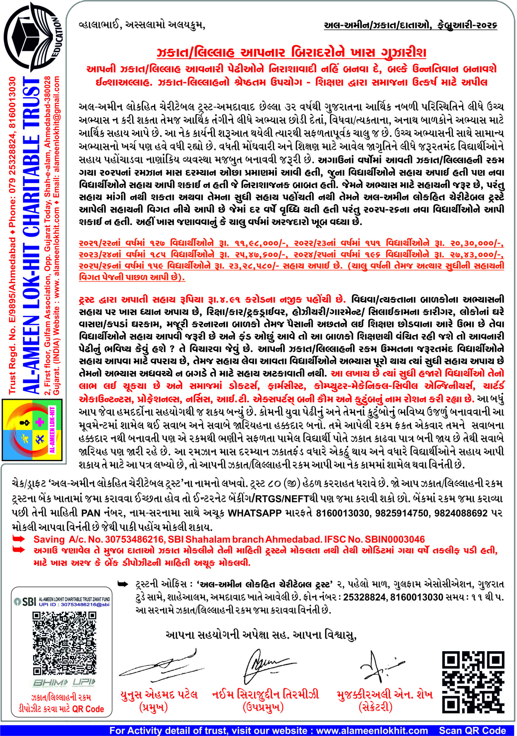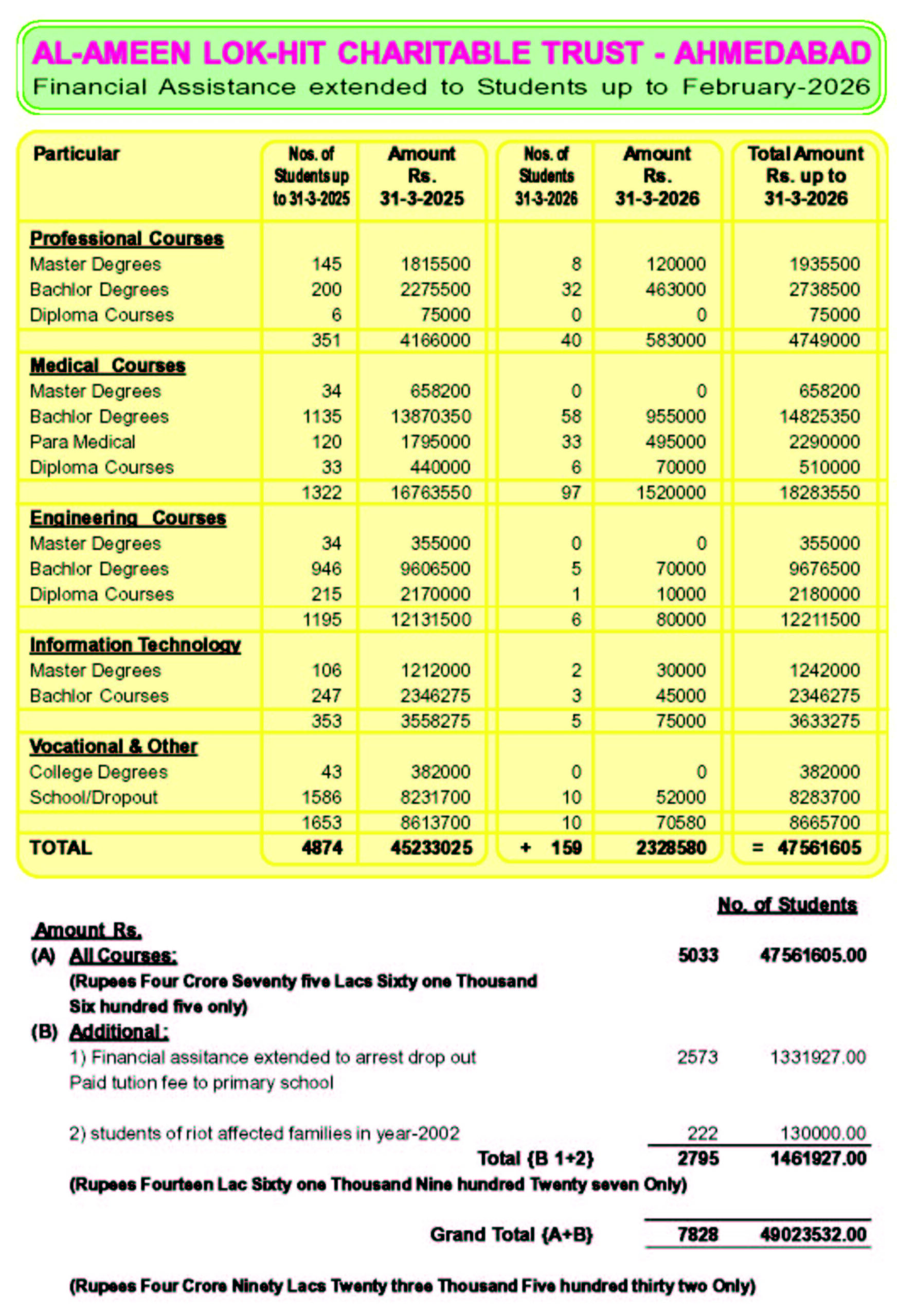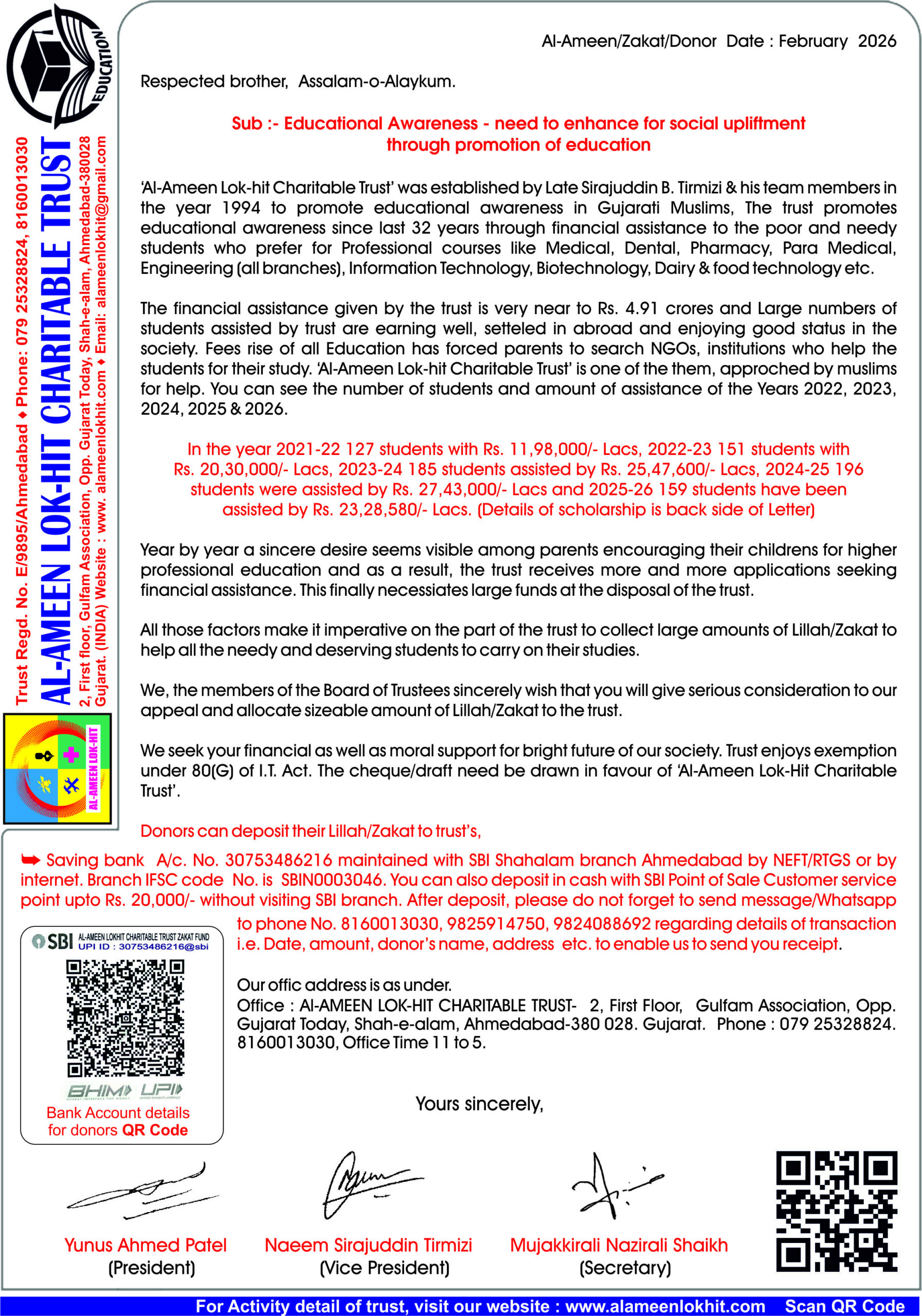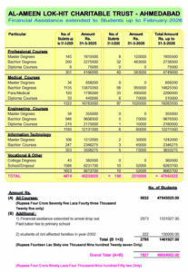 MILESTONE SERVICE FOR MUSLIM STUDENTS : Progress in number of students and amount of assistance In the year 2021-22 127 students with Rs. 11,98,000/- Lacs, 2022-23 151 students with Rs. 20,30,000/- Lacs, 2023-24 185 students assisted by Rs. 25,47,600/- Lacs, 2024-25 196 students were assisted by Rs. 27,43,000/- Lacs and 2025-26 158 students have been assisted by Rs. 23,10,000/- Lacs.